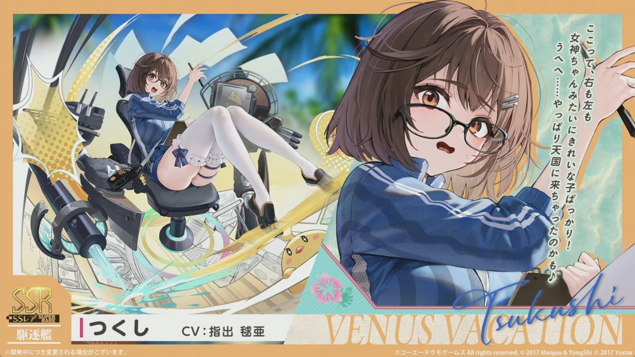 SSR駆逐「つくし」の排出率は0.5%となるでしょう。こちらはイベントPtを集めて交換するか、一部イベント海域でドロップも狙えるはず。
