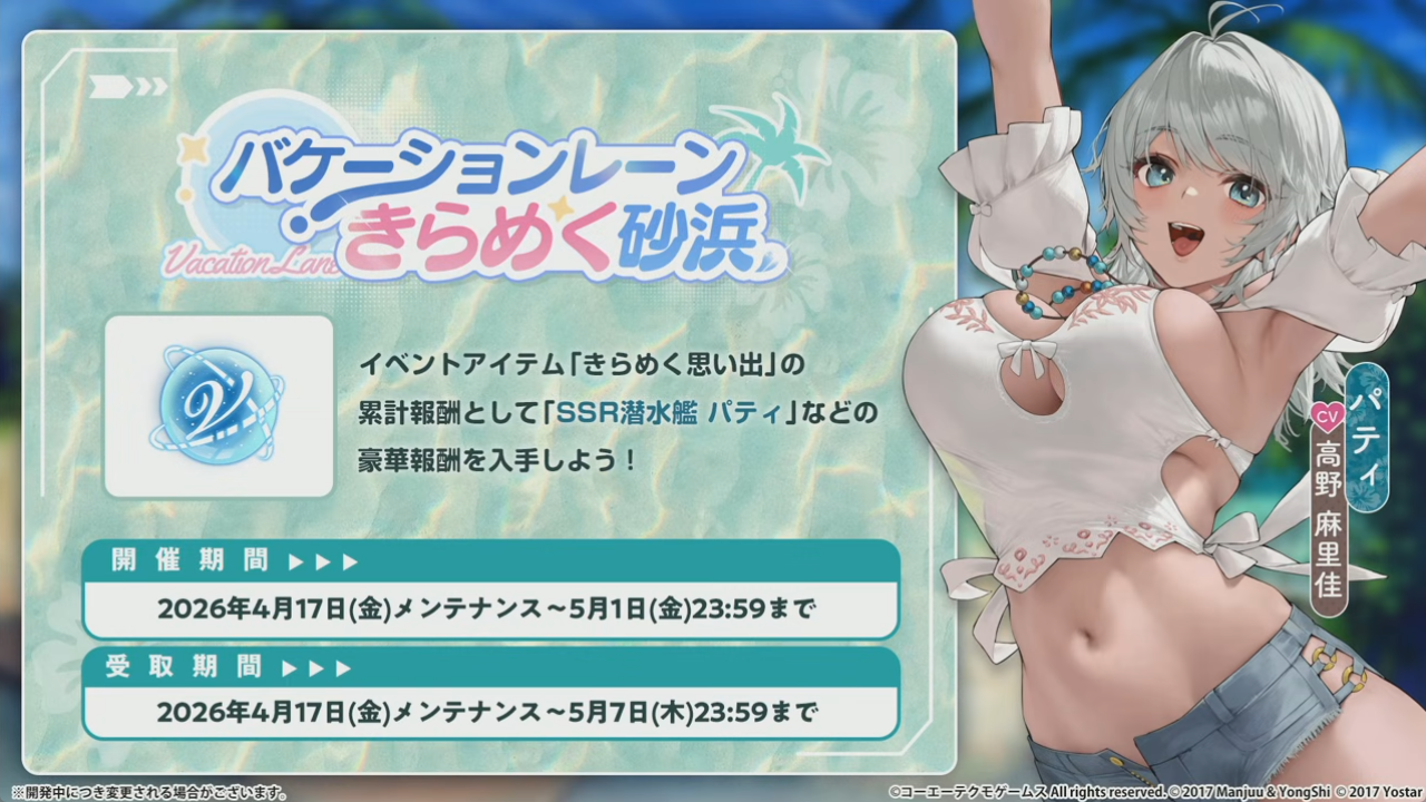 SSR潜水「パティ」は累計Pt報酬で受取可能。最大何隻入手できるかは不明。
