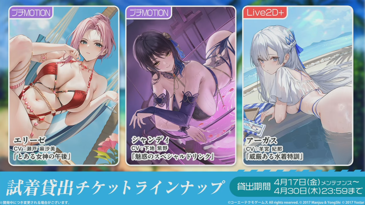 今回の試着貸出対象はエリーゼ、シャンディ、アーガス。対象の艦船を所持していれば、新規ドスケベスキンを一定期間だけお楽しみいただけます。