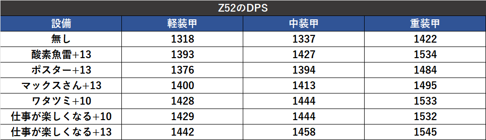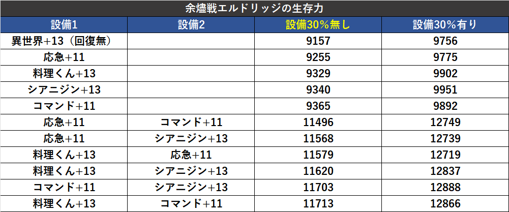 こちらはエルドリッジのステータスをモデルに耐久設備の強さをまとめたもの。生存効果も含めています。