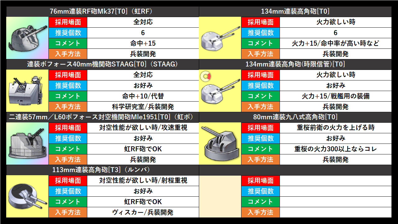 航空機が飛んでこない、あるいは戦艦編成の場合、命中か火力の上がる対空砲を装備します。