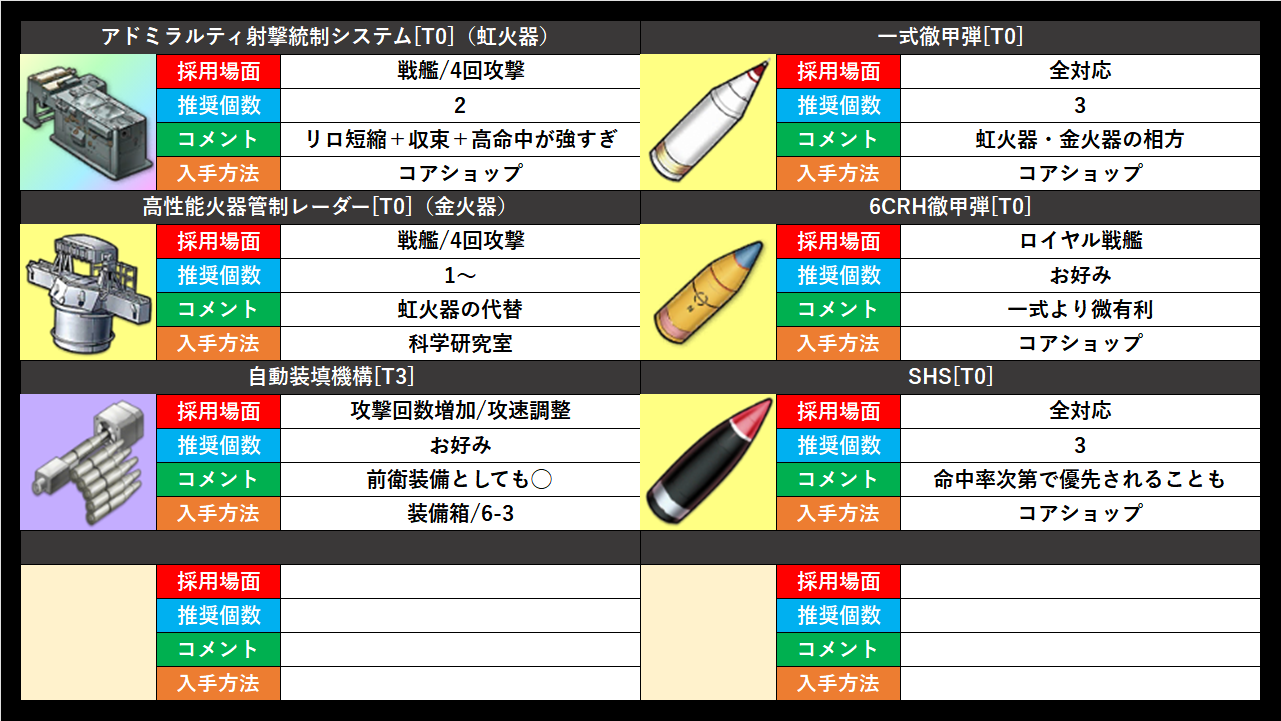 ロイヤル戦艦のみ、一式徹甲弾より6CRH徹甲弾が候補に挙がる。ただし、現在は戦艦の命中が高い傾向にあるため、DPSの差は1%未満といったところ。汎用性の低い6CRHに金パーツを投資するのはオススメしません。