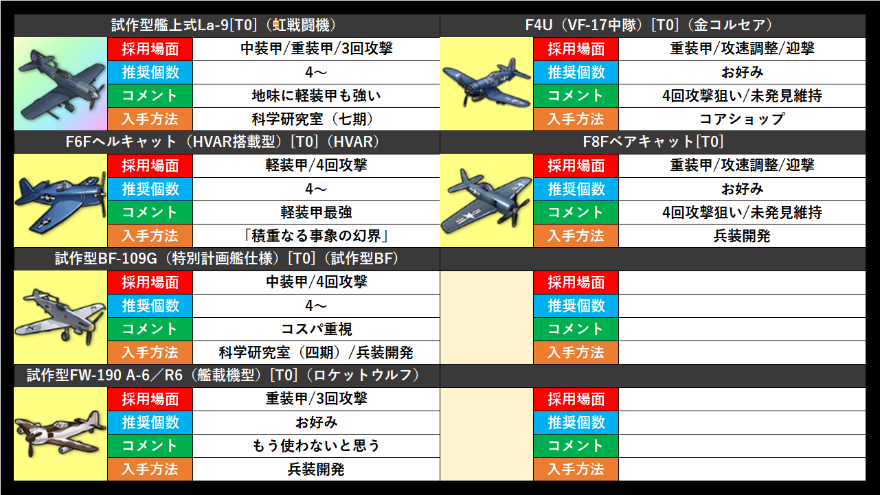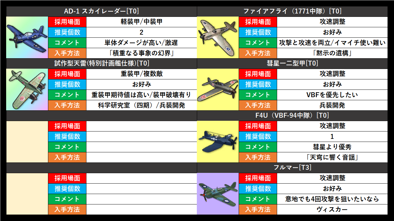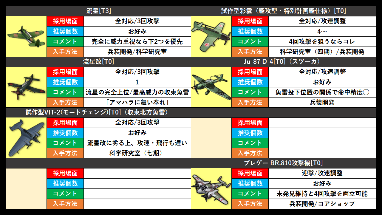 参考程度に大陸wikiの編成例を見てみると、1編成で多くても流星2機、スツーカ2機、北方魚雷3機、彩雲5機が使われている。