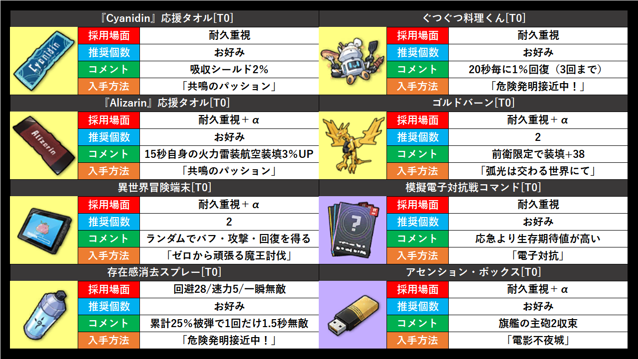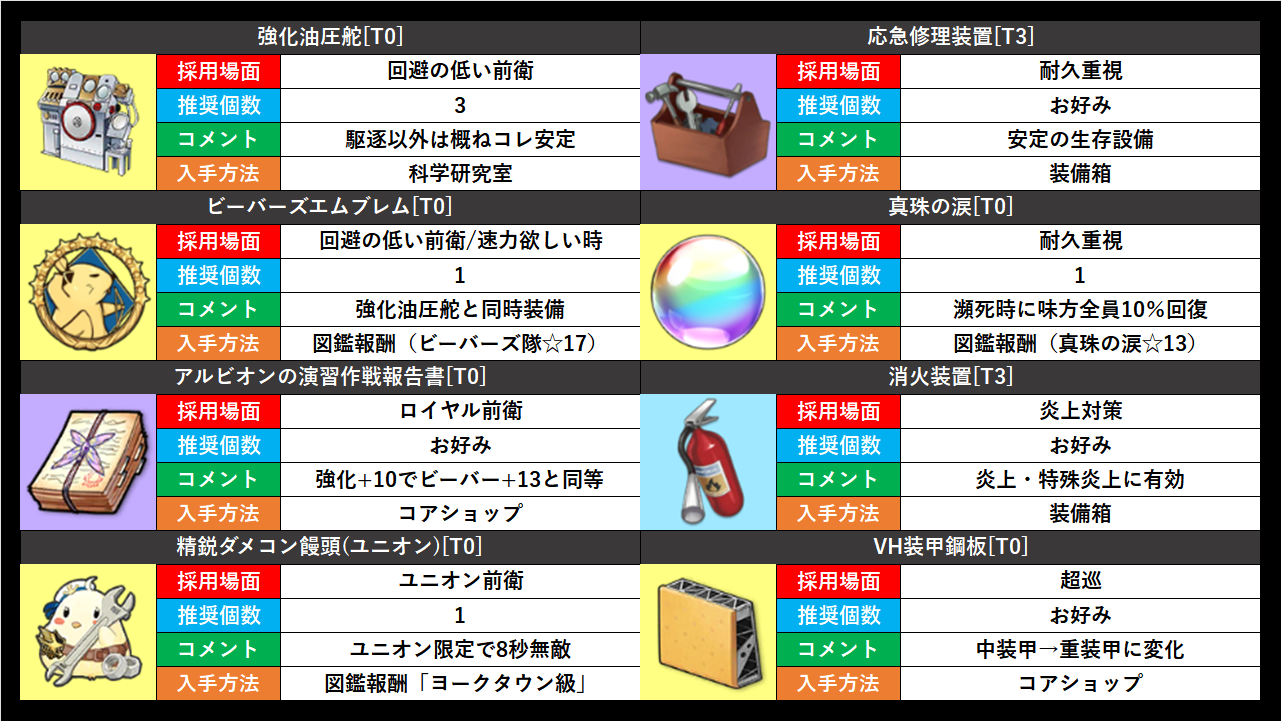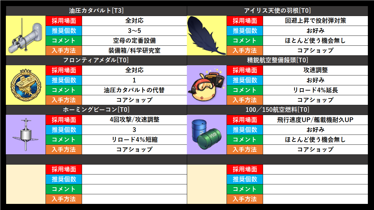 アイリス天使の羽根は少しだけ回避が上昇する。主力が投射弾に狙われる際に有効ですが、余燼戦で採用されるのは高耐久の虹空母なので、回避上昇が無くても耐えることがほとんど。
