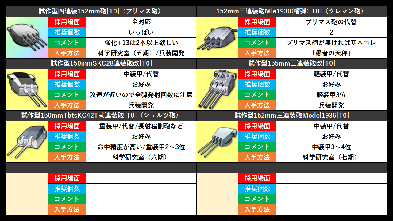 代替装備にはシャンパーニュ砲とフランドル砲が挙げられる。今後の余燼戦で通用するか不明ですが、過去の余燼戦ならガッツリ刺さるだろう。