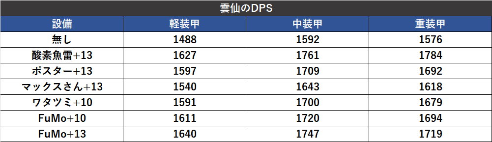 仮に雲仙がFuMOを装備した場合、重装甲DPSは1719ですが、酸素魚雷なら1784と大きな差が生まれます。