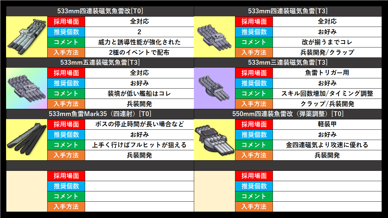 軽装甲相手には金弾薬調整を装備するのも有り。この魚雷は軽装甲に強く、1発で金四連磁気2発以上のダメージになります。