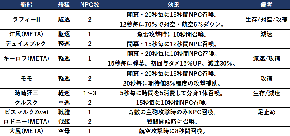 ダメージアップ効果は6隻編成でも90%の効果を得られる。さらに召喚したNPCもカウントされるため、特定の艦船を複数採用すれば最大180%アップします。